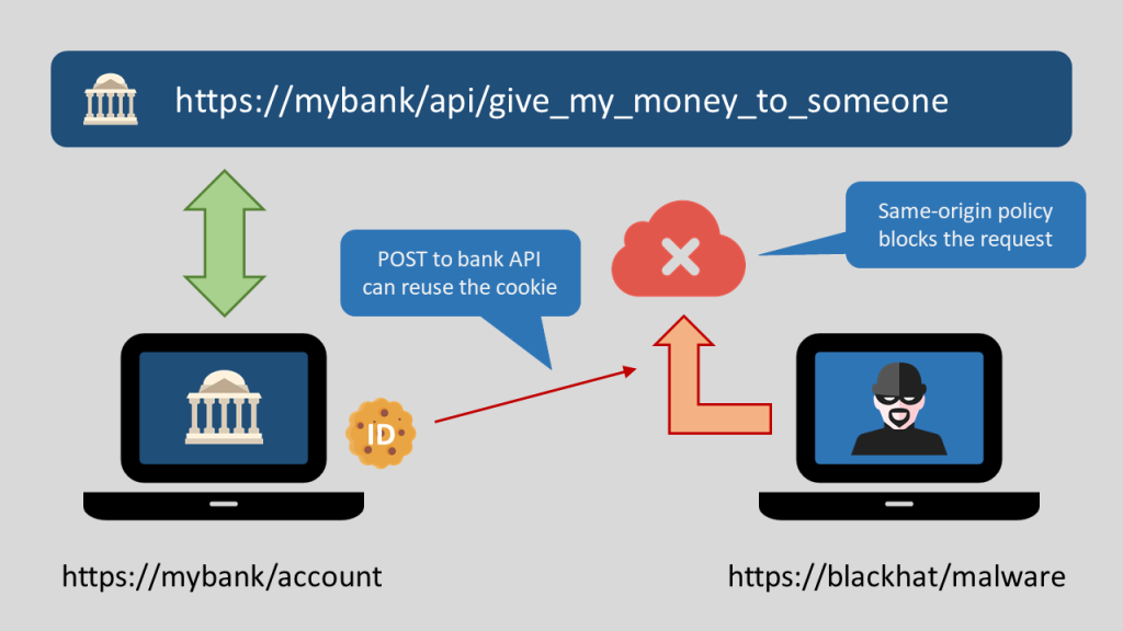 해커가 악성 코드를 사용해 쿠키를 탈취하여 해커의 사이트에서 해당 정보를 사용해 자신에게 돈을 이체하거나 하는 일이 방생할 수도 있기 때문이다. 이를 막기 위해 신뢰할만한 출처와만의 통신이 필요한데 동일 출처 정책은 잠재적으로 해로울 수 있는 문서를 분리하여 공격받을 수 있는 경로를 줄여준다.